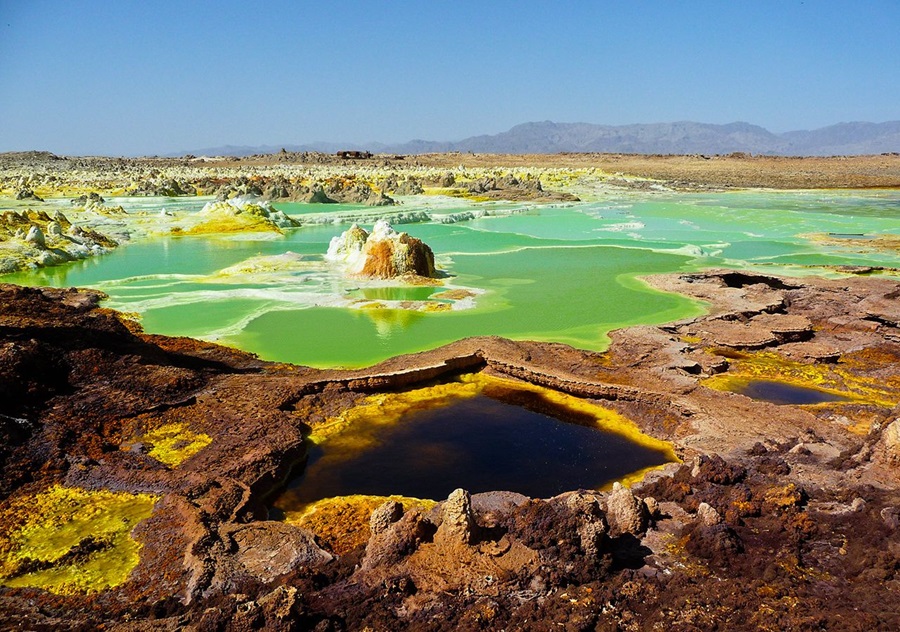 Con temperaturas que superan los 50 °C, géiseres de ácido, lagos de azufre y volcanes activos, este desierto colorido y peligroso parece un escenario alienígena. Solo puede visitarse con guías locales, en caravanas armadas y con estrictas precauciones. Pocos lugares ofrecen una experiencia visual y sensorial tan intensa.