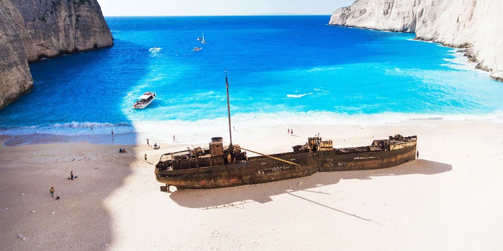 Situada en la isla de Zakynthos, Playa de Navagio es conocida por su icónica cala de arena blanca rodeada de impresionantes acantilados de roca caliza. A menudo se le conoce como la «Playa del Naufragio» debido al barco de carga varado en su costa desde hace décadas, creando una atmósfera misteriosa y única.