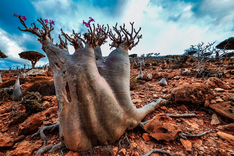 La isla de Socotra es conocida por su biodiversidad única y sus extrañas formas de vida. Los árboles «sangre de dragón» y otras especies endémicas crean un paisaje surrealista que parece sacado de una película de ciencia ficción.