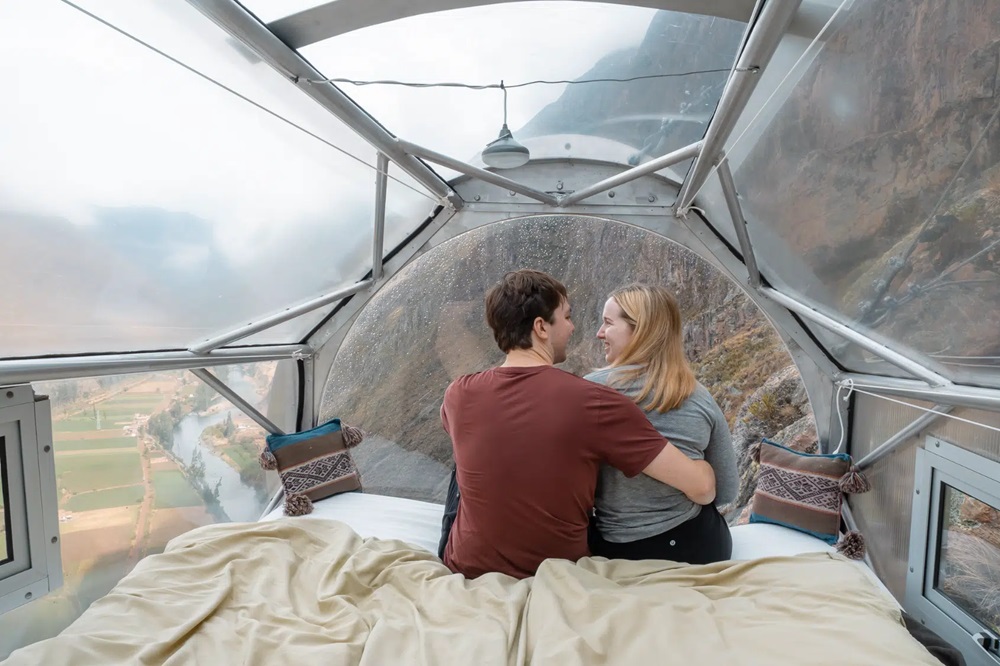Skylodge Adventure Suites, en el Valle Sagrado de Cusco, Perú, consiste en cápsulas transparentes de policarbonato suspendidas a 400 metros de altura en acantilados. Cada una, con capacidad para 8 personas, incluye camas, comedor y baño, con vistas de 300° al río Urubamba.