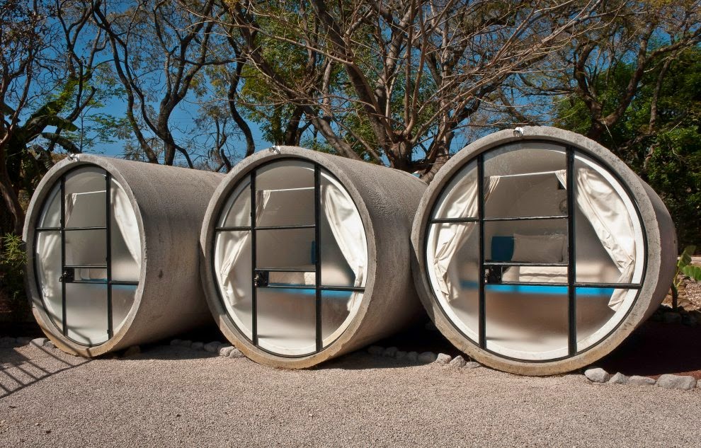 DasPark Hotel, en Ottensheim, Austria, ofrece habitaciones en forma de tubos de hormigón reciclado, como cápsulas futuristas de 2.4 metros de ancho con cama, baño y luces LED. Cada «habitación» es un espacio minimalista y aislado, evocando un diseño postapocalíptico.