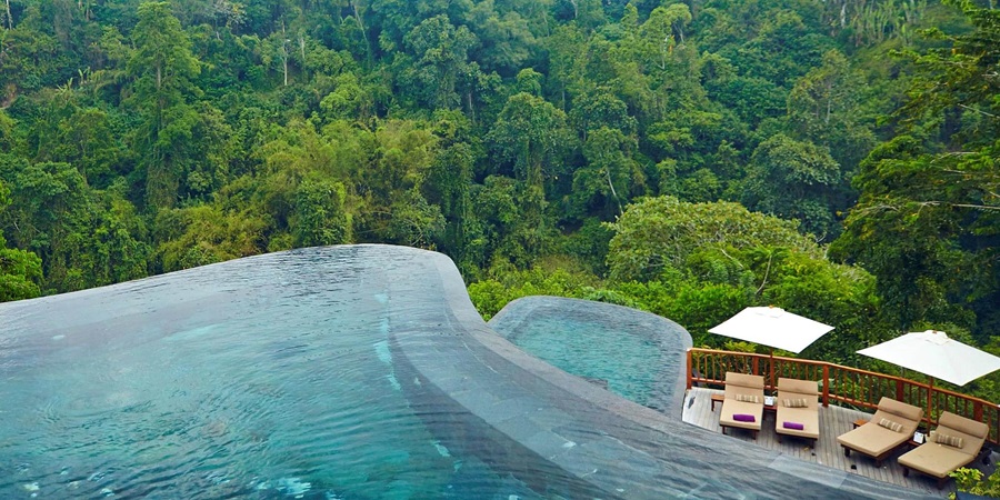 Hanging Gardens of Bali, en Ubud, Indonesia, es un resort con piscinas infinitas colgantes sobre la jungla, integradas en terrazas de arroz. Sus villas, con techos de bambú y vistas a la selva, parecen flotar en un mundo tropical etéreo.