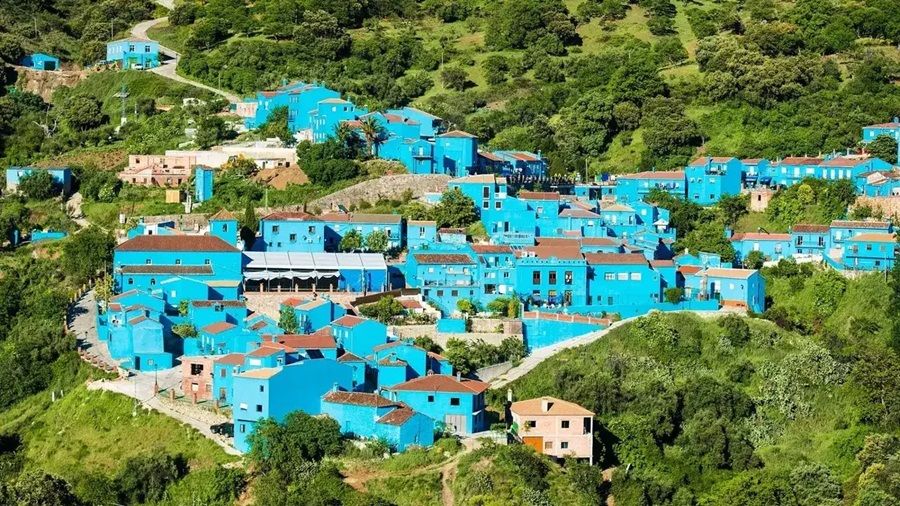 Júzcar, en Málaga, con 300 habitantes, es el «pueblo Smurf» pintado de azul en 2011 para una película. Sus casas azules y senderos en el bosque lo convierten en un rincón mágico.